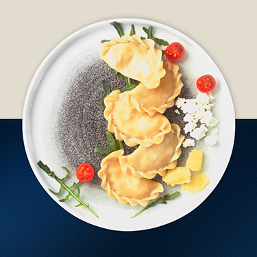 Czarne ravioli z wołowiną z lodami After Eight (grafika)