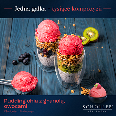 Pudding chia z granolą, owocami i sorbetem malinowym (grafika)