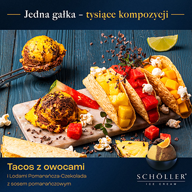 Tacos z owocami podane z lodami pomarańcza–czekolada z sosem pomarańczowym (grafika)
